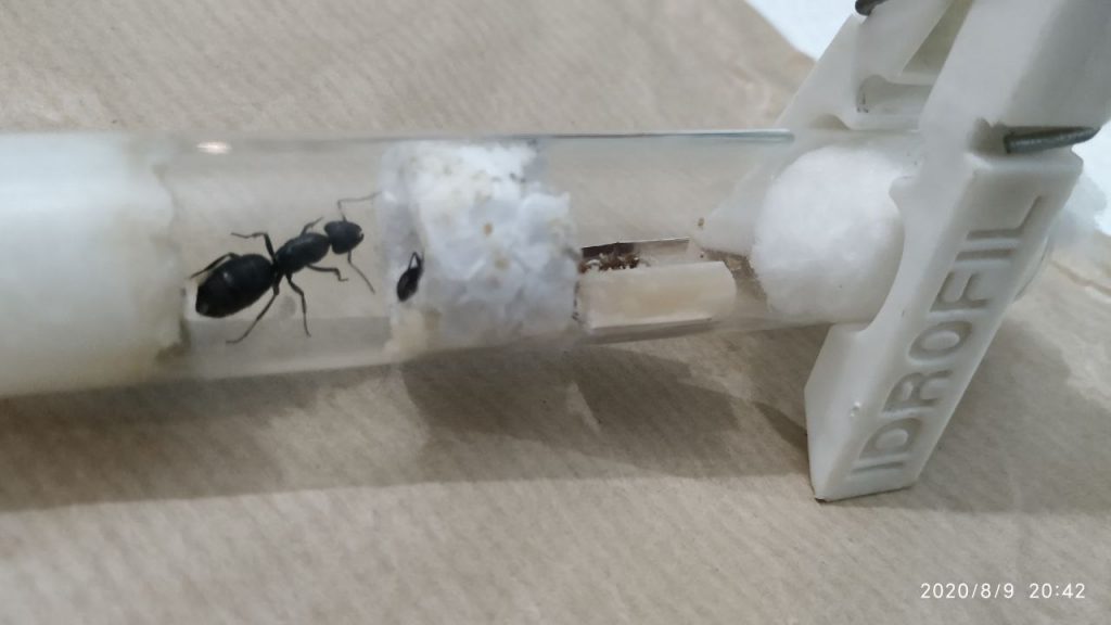 Quindi: è bene non fornire spazi inutilmente grandi in modo da non stressare una colonia facendola sentire “allo scoperto” e questo vale sia per le arene che per le provette.